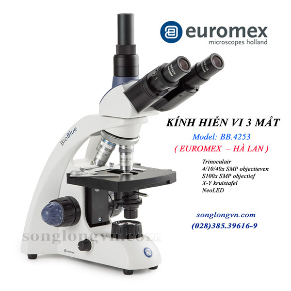 - Kính hiển vi 3 mắt BB.4253 là dòng kính hiển vi cao cấp của BioBlue Euromex đáp ứng nhu cầu nghiên cứu và quan sát cấu trúc tế bào (tế bào học), giải phẫu học, chuẩn đoán lâm sàng, vi sinh vật, các ứng dụng nâng cao trong công nghệ sinh học, khoa học sự sống, y tế...